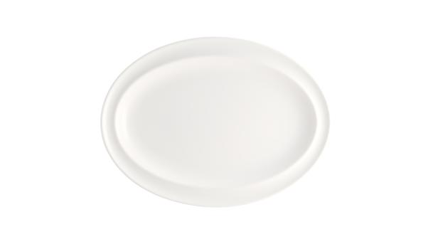 Блюдо овальное белого цвета со сливочным оттенком.