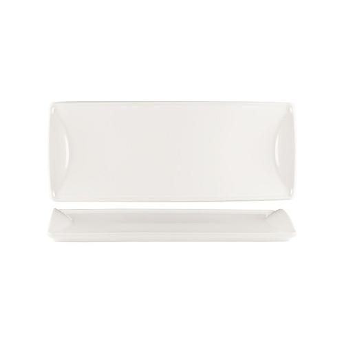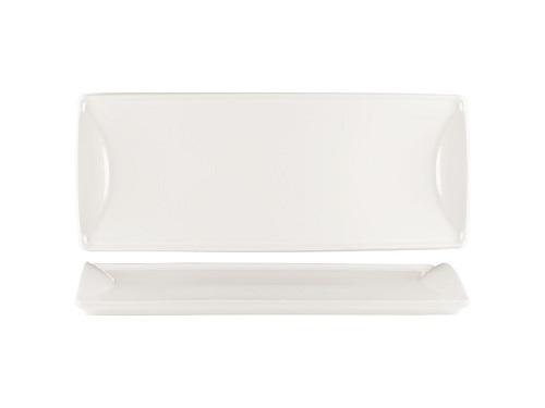 Блюдо прямоугольное белого цвета со сливочным оттенком.