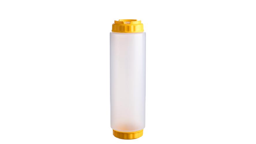 Емкость для соуса 1000 мл выполнена из прочного пищевого пластика и предназначена для профессионального использования в сегменте HoReCa. Конструкция имеет две откручивающиеся крышки и съемный силиконовый клапан, что обеспечивает удобство наполнения, использования и ухода, а также позволяет дозировать содержимое без подтеков и экономит место для хранения. Желтый цвет служит маркировкой для горчицы и меда. Прозрачный корпус облегчает визуальный контроль содержимого. Подходит для мытья в посудомоечной машине.