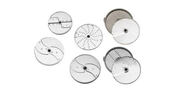 Комплект 8 дисков для R 502, CL 50 / CL 50 Ultra, CL 52: слайсер 2 мм (капуста, огурцы, лук) и 5 мм, терка 2 мм (морковь), соломка 3x3 мм (морковь для корейского салата), комплект для нарезки кубиками: ломтики10 мм + решетка 10x10 мм; комплект для приготовления фри 10 x 10 мм (2 диска).